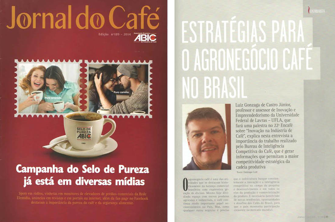 A edição 189 da revista Jornal do Café, publicação da Associação Brasileira da Indústria do Café (Abic) em dezembro, destacou o trabalho realizado na UFLA pelo professor e assessor de Inovação e Empreendedorismo da Universidade, Luiz Gonzaga de Castro Júnior. A revista dedicou cinco páginas à entrevista intitulada "Estratégias para o agronegócio café no Brasil" e deu ênfase para o trabalho realizado pelo professor no Bureau de Inteligência Competitiva do Café.