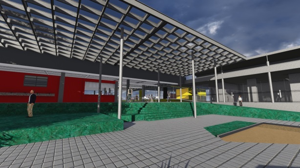Projeto do novo espaço de convivência. Do jardim entre RU e Cantina, vê-se o palco, a cantina, área coberta e estabelecimentos.[/caption]