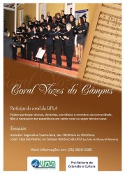 Sob orientação do Maestro Augusto Pimenta, o Coral Vozes do Câmpus, a Orquestra de Câmara da UFLA e as Oficinas de Música são espaços que vão além da experiência e do aprendizado musical. Esses projetos se transformam também em ambiente propício à integração de seus membros. Todas as atividades são gratuitas, abertas à participação de alunos, professores, técnicos administrativos e moradores de Lavras e região.