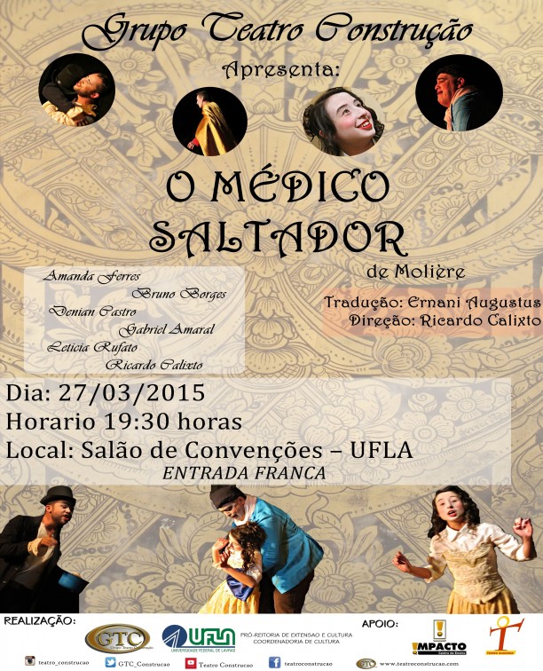 Em comemoração ao Dia Mundial do Teatro, celebrado em 27 de março (sexta-feira), será apresentado no Salão de Convenções da Universidade Federal de Lavras (UFLA), às 19h30, o espetáculo “O Médico Saltador”, promovido pelo Teatro Construção. A entrada é franca e, na ocasião, também haverá um monólogo de Homero Carvalho Faria sobre o Dia Mundial do Teatro.
