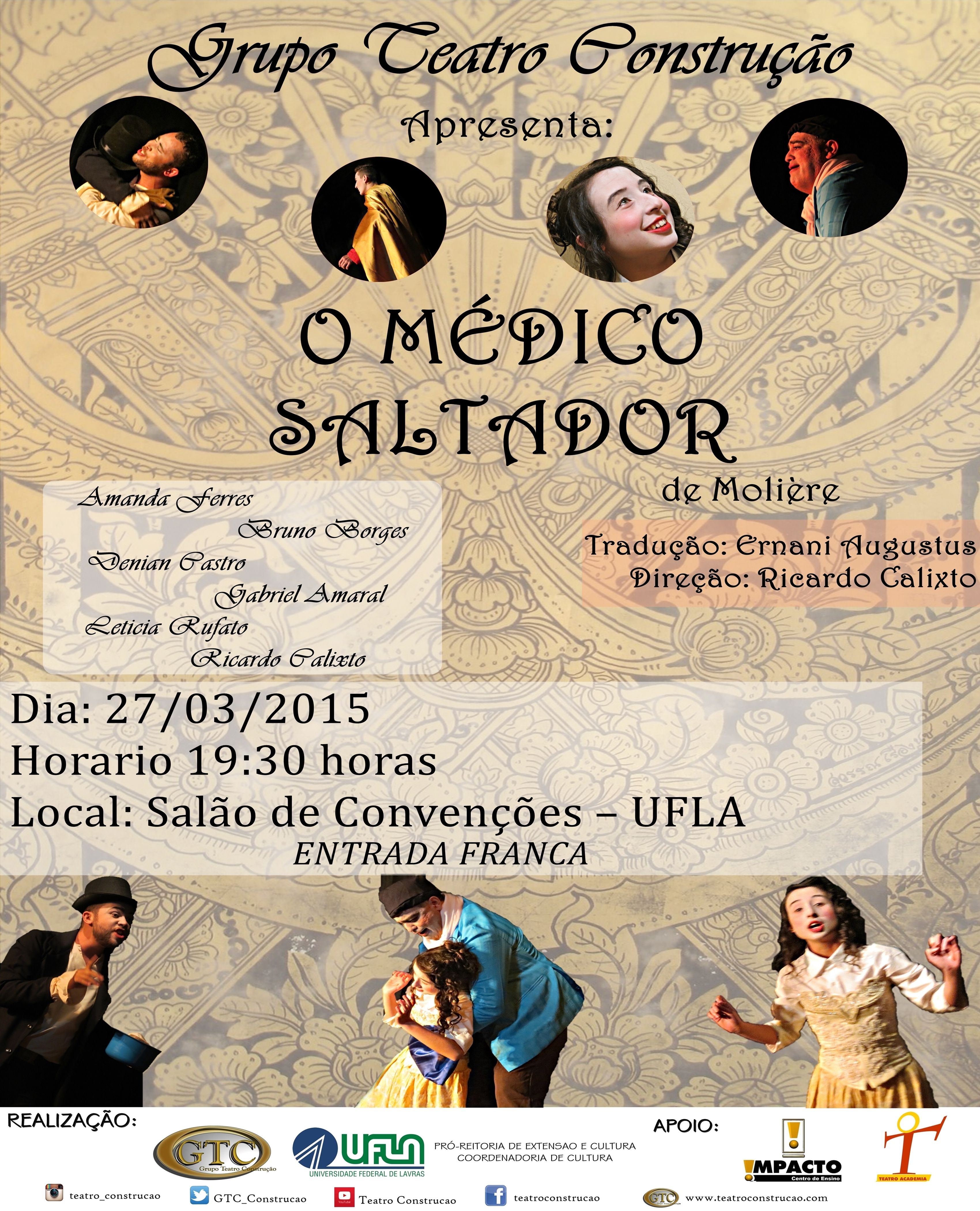 O Médico Saltador - Peça do francês Molière (1622-1673), conta com a adaptação e direção de Ricardo Calixto. Trata das impagáveis peripécias de um criado para promover a união do patrão com a sua amada. O escritor tem como característica marcante satirizar a precária ciência do seu tempo, no caso a medicina. Costuma fazer uma crítica à relação médico-paciente.