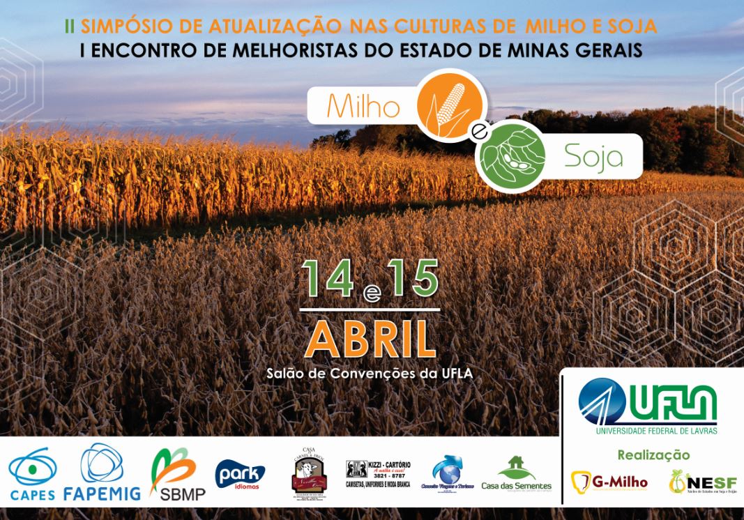 Será realizado na Universidade Federal de Lavras (UFLA) o II Simpósio de Atualização nas Culturas de Milho e Soja e o I Encontro de Melhoristas do Estado de Minas Gerais. O evento ocorrerá nos dias 14/4 e 15/4, no Salão de Convenções. Os interessados podem se inscrever na área em que está funcionando a Cantina Central, ou pelo e-mail Este endereço de email está sendo protegido de spambots. Você precisa do JavaScript ativado para vê-lo..