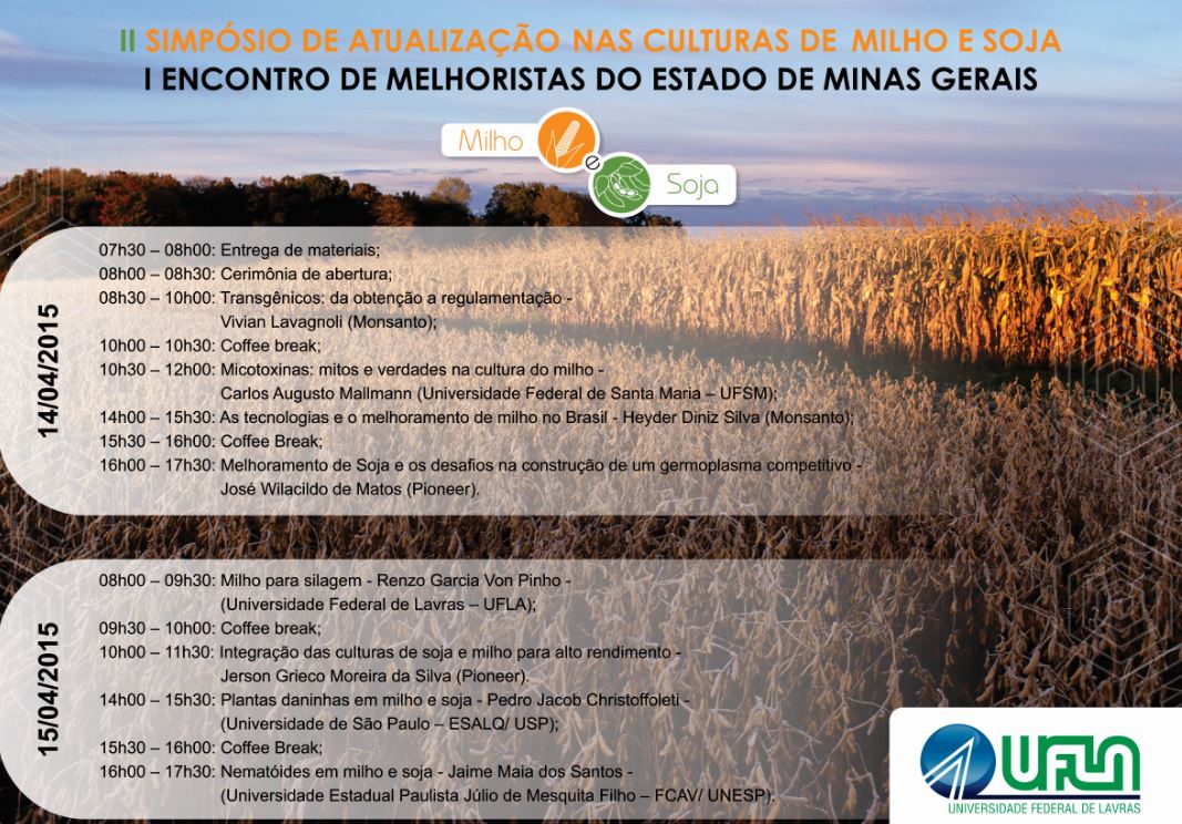 Repetindo o êxito dos encontros técnicos da cultura do milho, realizados na Universidade Federal de Lavras (UFLA) na década de 1990, nesta terça e quarta-feira (14 e 15/4), estudantes e profissionais participam do II Simpósio de Atualização nas Culturas de Milho e Soja. O evento é organizado pelos Núcleos de Estudos em Milho e Sorgo (G-Milho) e pelo Núcleo de Estudos em Soja e Feijão (Nesf), que têm a orientação dos professores Renzo Garcia Von Pinho e Adriano Teodoro Bruzi, respectivamente.