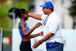 Depois do salto que conquistou o índice para os Jogos Pan-Americanos, a atleta Jennifer Nicole correr para comemorar com o treinador, professor Fernando Oliveira. Foto: CBAt[/caption]