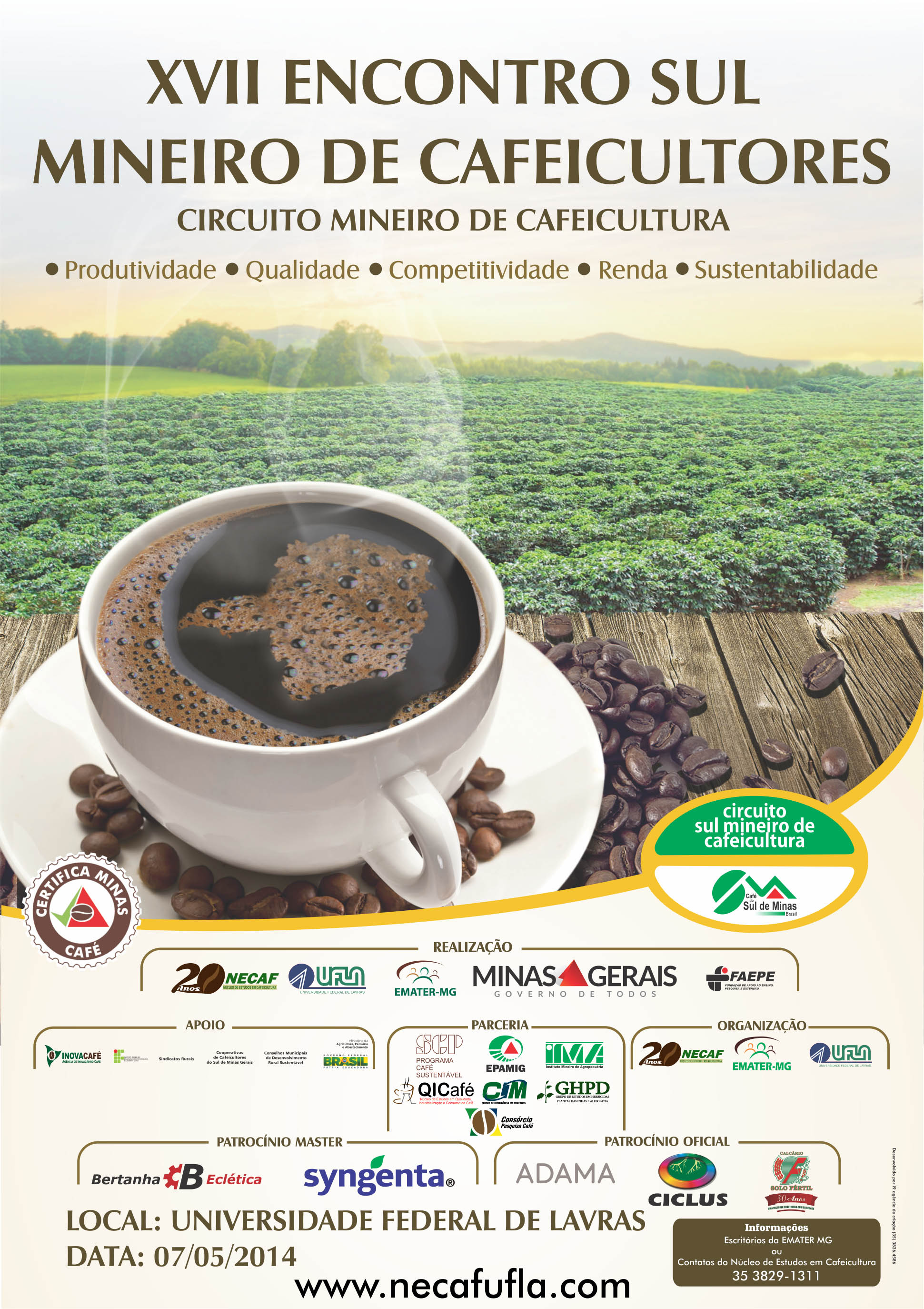 As inscrições deverão ser feitas no início do evento. O Circuito é uma realização do Núcleo de Estudos em Cafeicultura da UFLA, Emater-MG, Governo de Minas Gerais e Fundação de Apoio ao Ensino, Pesquisa e Extensão (Faepe).