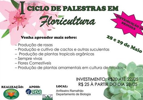 Membros da comunidade acadêmica, assim como moradores de Lavras e região, terão a oportunidade de aprender sobre a produção de rosas, cactos, plantas tropicais orgânicas, sempre-vivas, flores comestíveis e plantas ornamentais em cultura de tecidos. Os temas serão tratados no I Ciclo de Palestras em Floricultura, a ser realizado em 28 e 29 de maio, na Universidade Federal de Lavras (UFLA).
