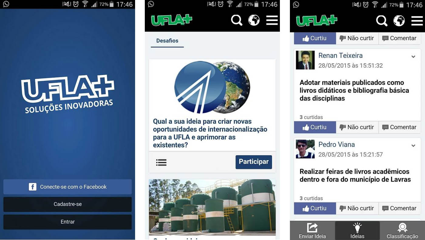 No Desafio UFLA+, qualquer usuário pode enviar ideias inovadoras que possibilitem melhorias acadêmicas e administrativas na Universidade Federal de Lavras. As ideias enviadas, comentários em ideias de outros usuários e curtidas valem pontos; o setor administrativo da UFLA e a entidade estudantil cujos membros mais somarem pontos serão premiadas, assim como os três usuários que obtiverem mais pontos no final dos desafios. Os interessados podem se cadastrar no site www.uflamais.ufla.br.