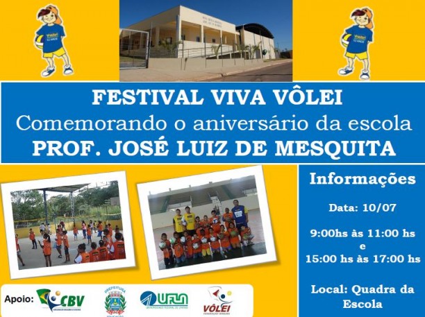 O Festival comemorará o aniversário da Escola Professor José Luiz de Mesquita, no bairro Cidade Nova, e será realizado das 9h às 11h e das 15h às 17h, com a participação de crianças entre sete e 15 anos. Além das partidas de vôlei, a programação compreende outras atividades de recreação.