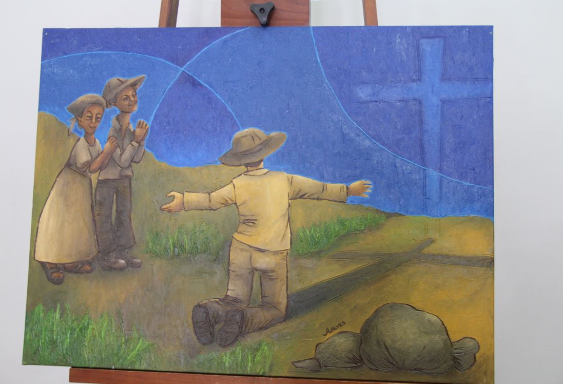 Tela (em exposição) que retrata o personagem "Nhô-Augusto", do conto "A hora e a vez de Augusto Matraga", narrado por Dôra Guimarães e Tiago Goulart. A tela é de Adriano Alves.[/caption]