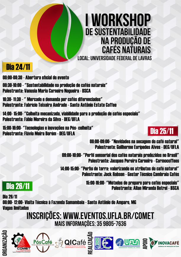 A realização do evento será de responsabilidade do Núcleo de Estudos em Pós-colheita do Café (Pós-Café) e do Núcleo de Estudos em Qualidade, Industrialização e Consumo de Café (QI-Café).