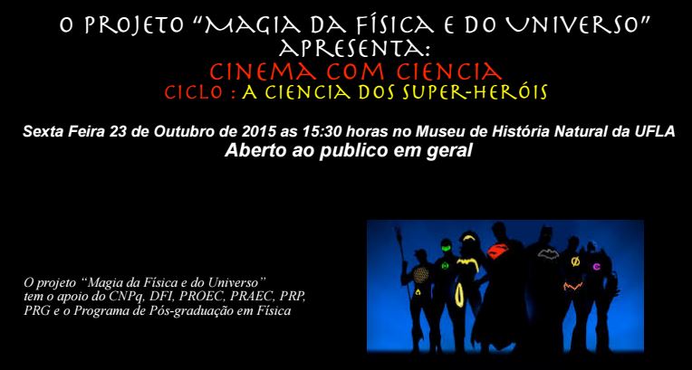 Nesta sexta feira (23/10), o projeto ‘A Magia da Física e do Universo’, inicia mais um ciclo de filmes ‘Cinema com Ciência’, desta vez, destacando a ciência dos super-heróis. A exibição dos filmes será toda sexta-feira, às 15h30, no Museu de História Natural. Após as apresentações dos filmes, haverá debate para avaliação dos pontos de vista filosófico, social e ético. Também serão selecionadas cenas surpreendentes do ponto de vista científico para análise crítica.