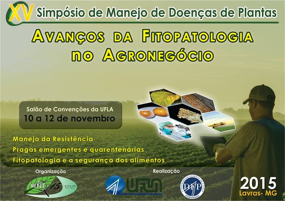 Entre os dias 10 e 12 de novembro será realizado na Universidade Federal de Lavras (UFLA) o XV Simpósio de Manejo de Doenças de Plantas. Neste ano, a temática será “Avanços da Fitopatologia Aplicados ao Agronegócio”. O evento é organizado pelo Núcleo de Estudos em Fitopatologia (Nefit) e pelo Departamento de Fitopatologia (DFP/UFLA).