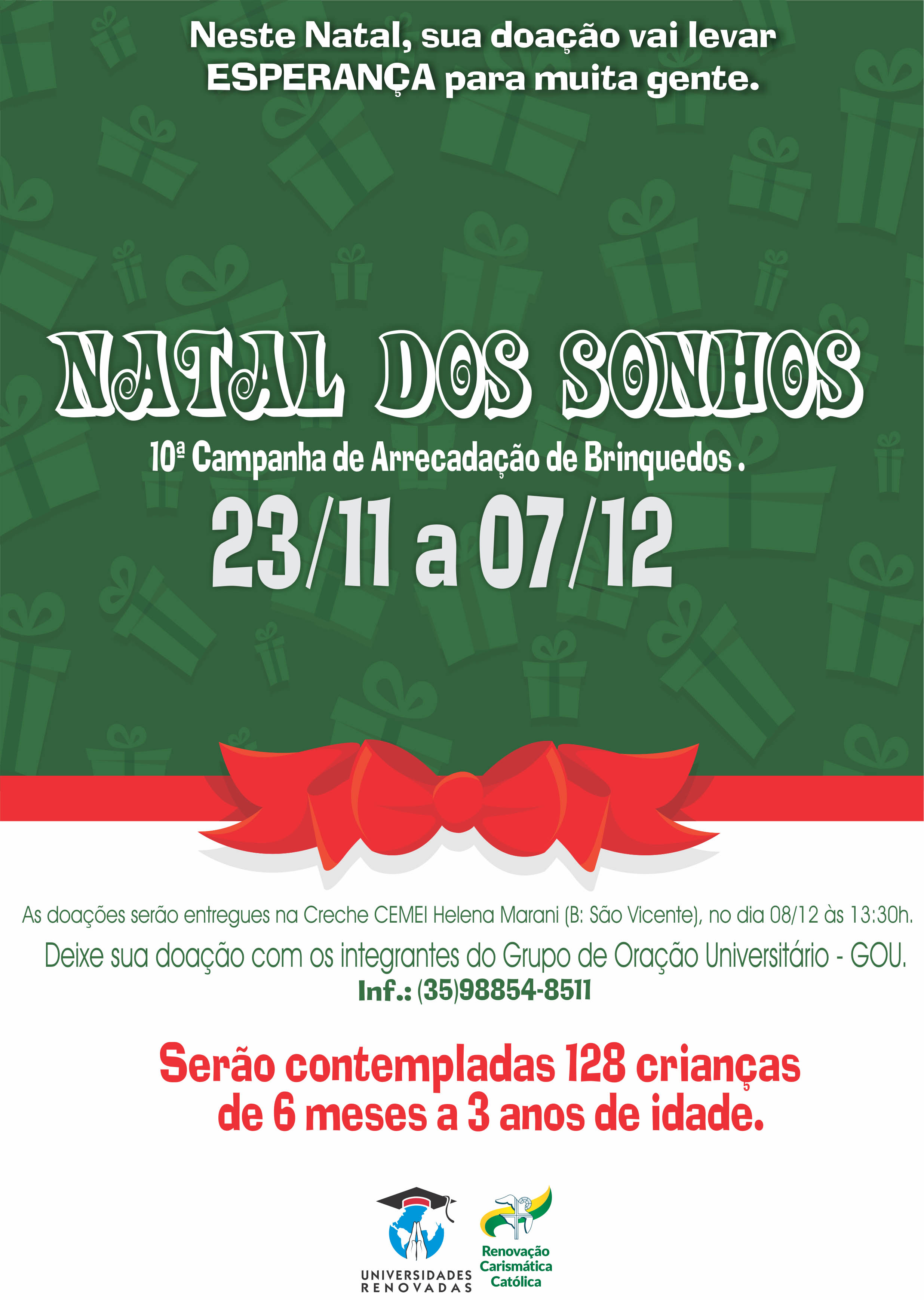 O Ministério Universidades Renovadas, formado pelos Grupos de Oração Universitários (GOU’s) e Grupos de Partilha e Perseverança (GPP’s), lançou nessa segunda-feira (23) a 10ª campanha “Natal dos Sonhos”. Essa iniciativa tem buscado contemplar uma creche municipal, a cada ano, com a entrega de brinquedos arrecadados nas universidades e faculdades da cidade.