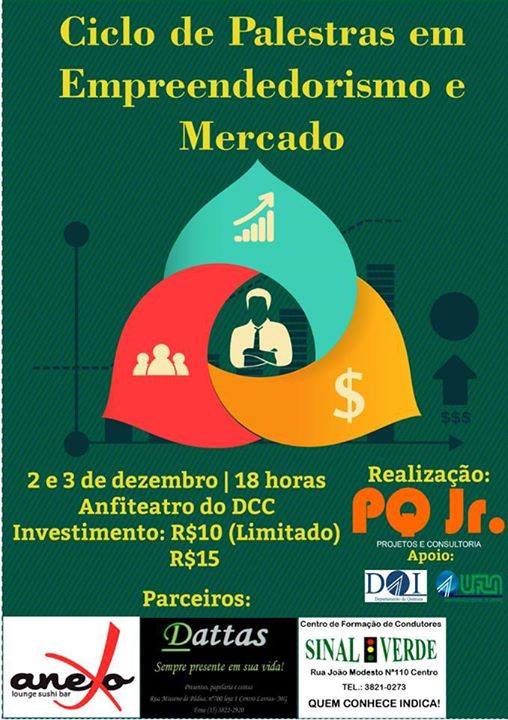 A empresa júnior - PQ Júnior Projetos e Consultoria, da Universidade Federal de Lavras (UFLA), realizará nos dias 2 e 3 de dezembro um ciclo de palestras sobre empreendedorismo e mercado. O evento será às 18 horas, no Anfiteatro do Departamento de Ciência da Computação (DCC/UFLA).