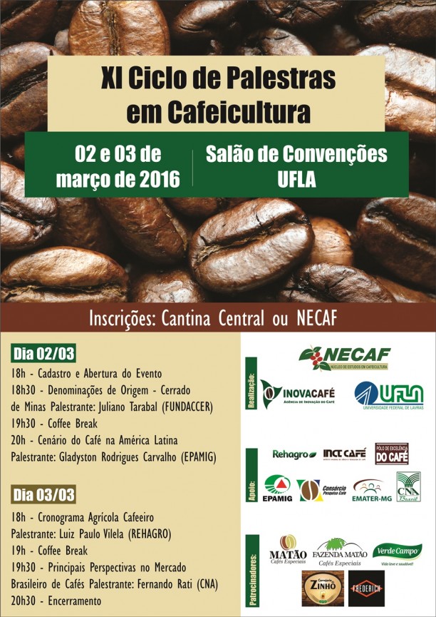 O Núcleo de Estudos em Cafeicultura (Necaf) realizará nos dias 2 e 3 de março o XI Ciclo de Palestras em Cafeicultura. O evento conta com apresentações sobre: “Denominações de Origem - Cerrado de Minas” com o superintendente da Fundação Café do Cerrado (Fundaccer), Juliano Tarabal, “Cenário do Café na América Latina” com o pesquisador da Empresa de Pesquisa e Agropecuária de Minas Gerais (Epamig), Gladyston Rodrigues Carvalho, “Cronograma Agrícola Cafeeiro” com o consultor e engenheiro agrônomo da Empresa Rehagro, Luiz Paulo Vilela e “Principais Perspectivas no Mercado Brasileiro de Cafés” com o assessor técnico da Confederação da Agricultura e Pecuária do Brasil (CNA), Fernando Rati.