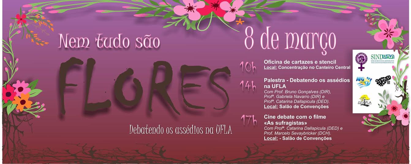 O ato “Nem tudo são Flores – Debatendo os assédios na UFLA”, reúne a Associação dos Docentes da Universidade Federal de Lavras (Adufla), o Sindicato dos Servidores Técnicos Administrativos em Educação das Instituições Federais de Ensino Superior de Lavras (Sindufla), o Diretório Central dos Estudantes (DCE) e a Associação de Pós-Graduandos (APG), além da participação do Coletivo Mulheres da UFLA e do Levante Popular da Juventude.