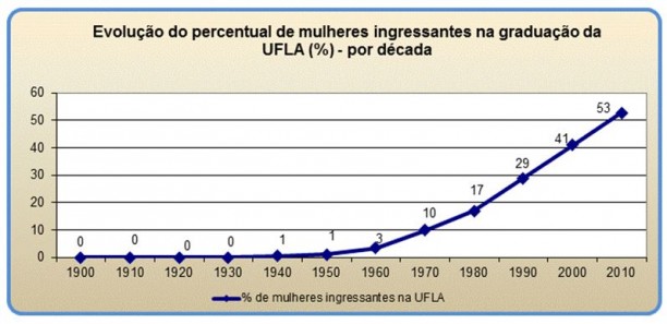 De 1908 a 1947, a Escola Superior de Agricultura de Lavras (ESAL) recebeu 399 alunos em seu curso de graduação da época (Agronomia). Eram todos homens. Apenas em 1948, ou seja, quarenta anos depois, houve o ingresso da primeira estudante. A participação permaneceu semelhante – tímida - até o final da década de 1960. Nos anos de 1970, a presença das graduandas passou a 10% do total de alunos; a partir de então, seguiu em crescimento contínuo, alcançando, nos processos seletivos de ingresso de 2011, um momento histórico: 54,6% dos novos alunos da época eram mulheres.