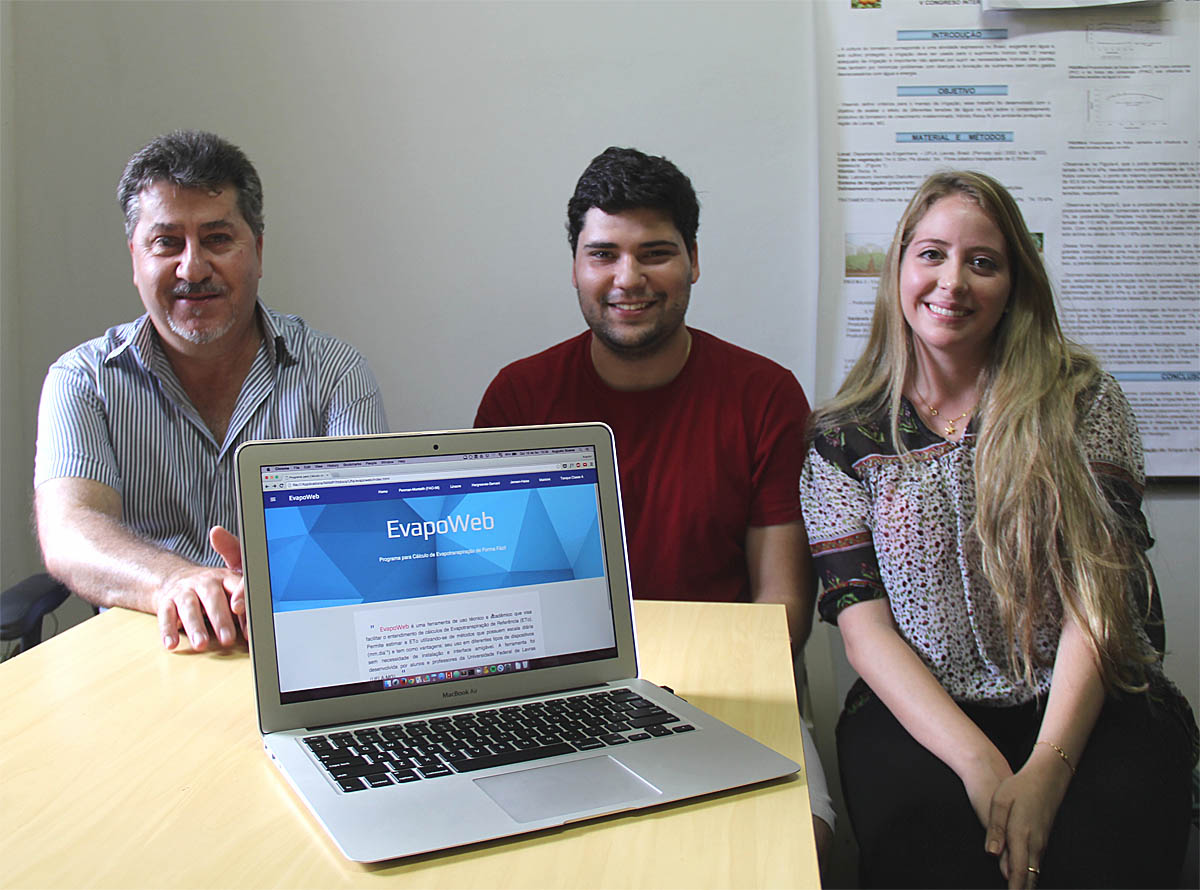 Prof. Geraldo e os discentes Augusto e Thaís, três dos desenvolvedores do EvapoWeb.[/caption]