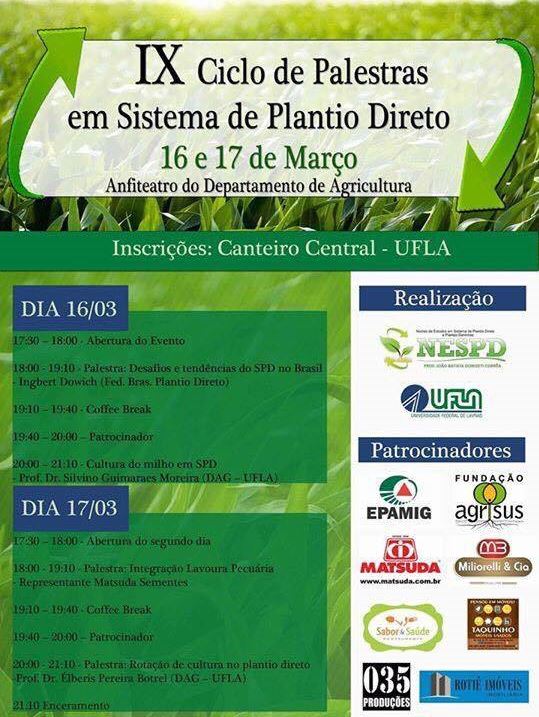 Começa nesta quarta-feira (16/3) o IX Ciclo de Palestras em Sistema de Plantio Direto. O evento será realizado no Anfiteatro do Departamento de Agricultura da Universidade Federal de Lavras (DAG/UFLA). A programação inclui quatro palestras e termina na noite de quinta-feira (17/3).