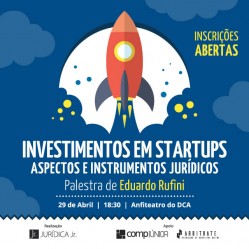 As inscrições para a palestra “Investimento em Startups: Aspectos e Instrumentos Jurídicos” já estão abertas. O evento será realizado no dia 29 de abril, das 18h30 às 21 horas, no Anfiteatro do Departamento de Ciência dos Alimentos (DCA). O palestrante será o advogado Eduardo Rufini, especialista em Direito Societário e Fusões & Aquisições (M&A), que apresentará os principais aspectos jurídicos associados às startups, incluindo contratos preliminares, o regime tributário, aspectos societários e formas de investimento.