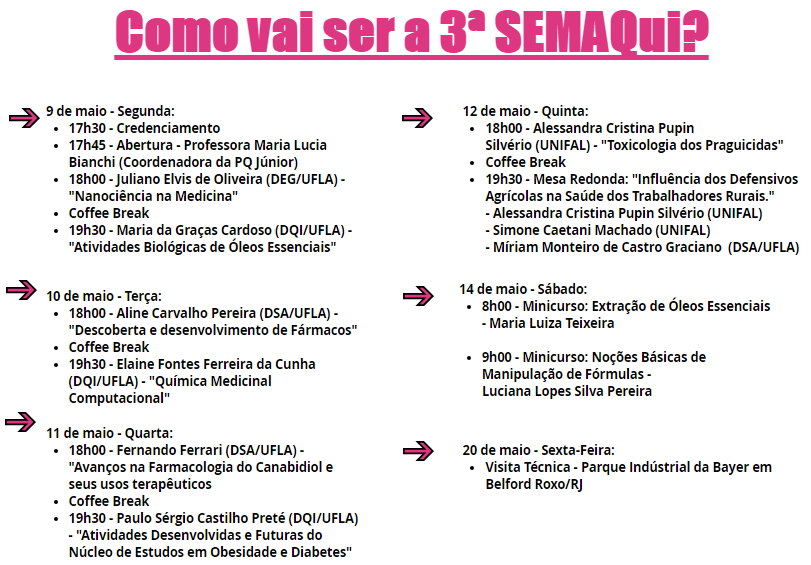A Semana da Química da Universidade Federal de Lavras (SEMAQui/UFLA) será promovida em 2016 com uma programação extensa. Nesta terceira edição haverá oito palestras, uma visita técnica e um minicurso, entre os dias 9 e 14 de maio.