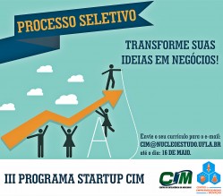 O processo seletivo para o III Programa Startup CIM está aberto e recebe inscrições até o dia 16 de maio. Estudantes de todos os cursos de graduação e pós-graduação da UFLA podem participar. Para isso, basta encaminhar e-mail para: Este endereço de email está sendo protegido de spambots. Você precisa do JavaScript ativado para vê-lo., informando nome completo, curso e período em que está matriculado.