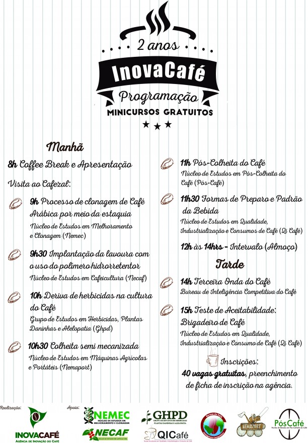 Serão disponibilizadas 40 vagas gratuitas e os inscritos terão um dia especial com apresentação da agência, visita ao Cafezal, participação em sete minicursos e do teste de aceitabilidade de Brigadeiro de Café. As inscrições serão realizadas apenas presencialmente na Secretaria Geral da agência, a partir dessa terça-feira (21) em horário comercial, a participação é aberta para estudantes, professores, colaboradores da UFLA e toda comunidade de Lavras e região.