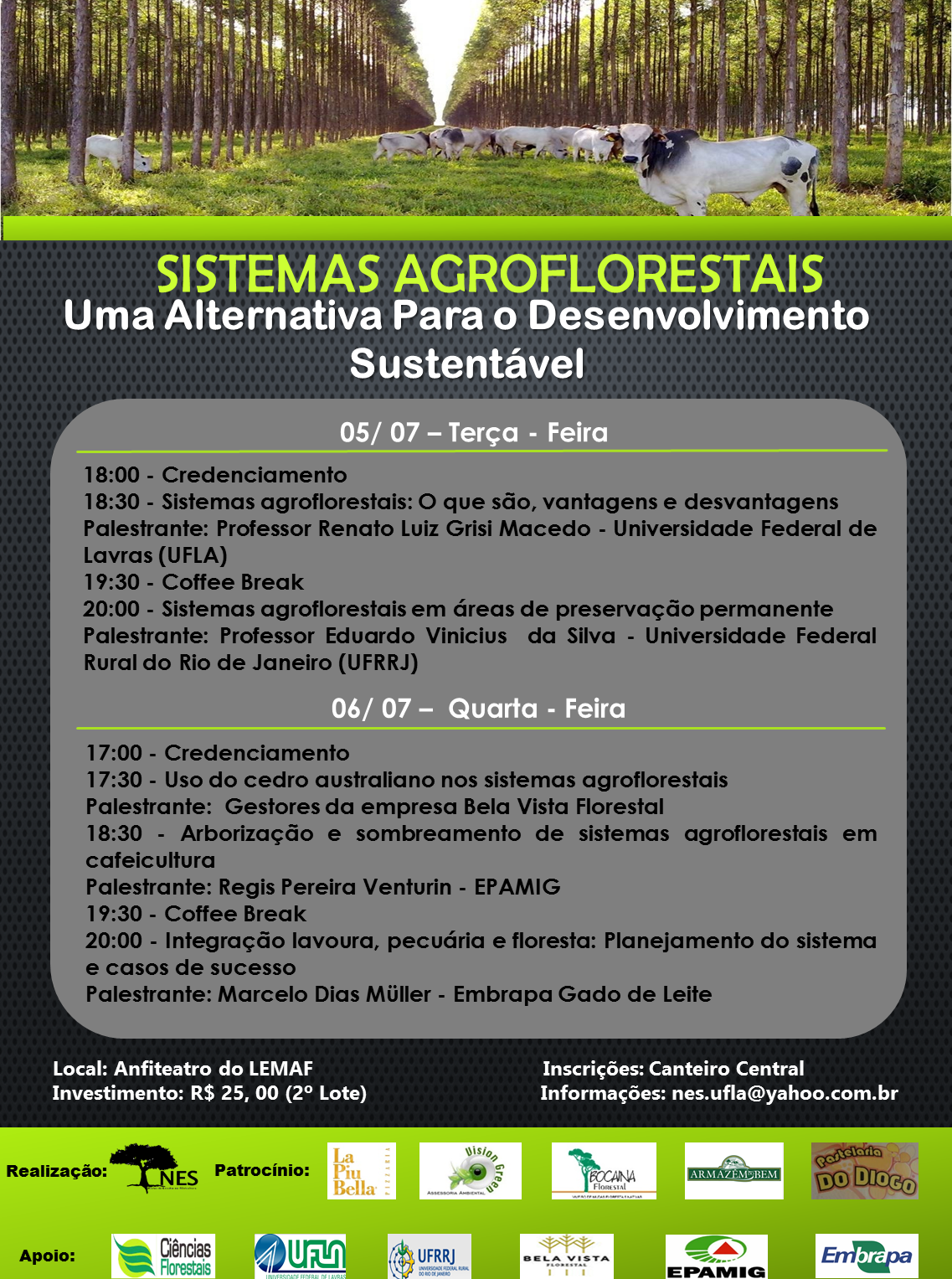 O Núcleo de Estudos em Silvicultura (NES), da Universidade Federal de Lavras (UFLA), organiza um ciclo de palestras intitulado "Sistemas Agroflorestais: Uma alternativa para o desenvolvimento sustentável". O evento é destinado aos discentes de todos os cursos da UFLA na grande área das Ciências Agrárias e aos produtores rurais da região, com o intuito de expor como é o funcionamento destes sistemas, assim como suas influências ecológicas, conservacionistas, econômicas e suas aplicabilidades.