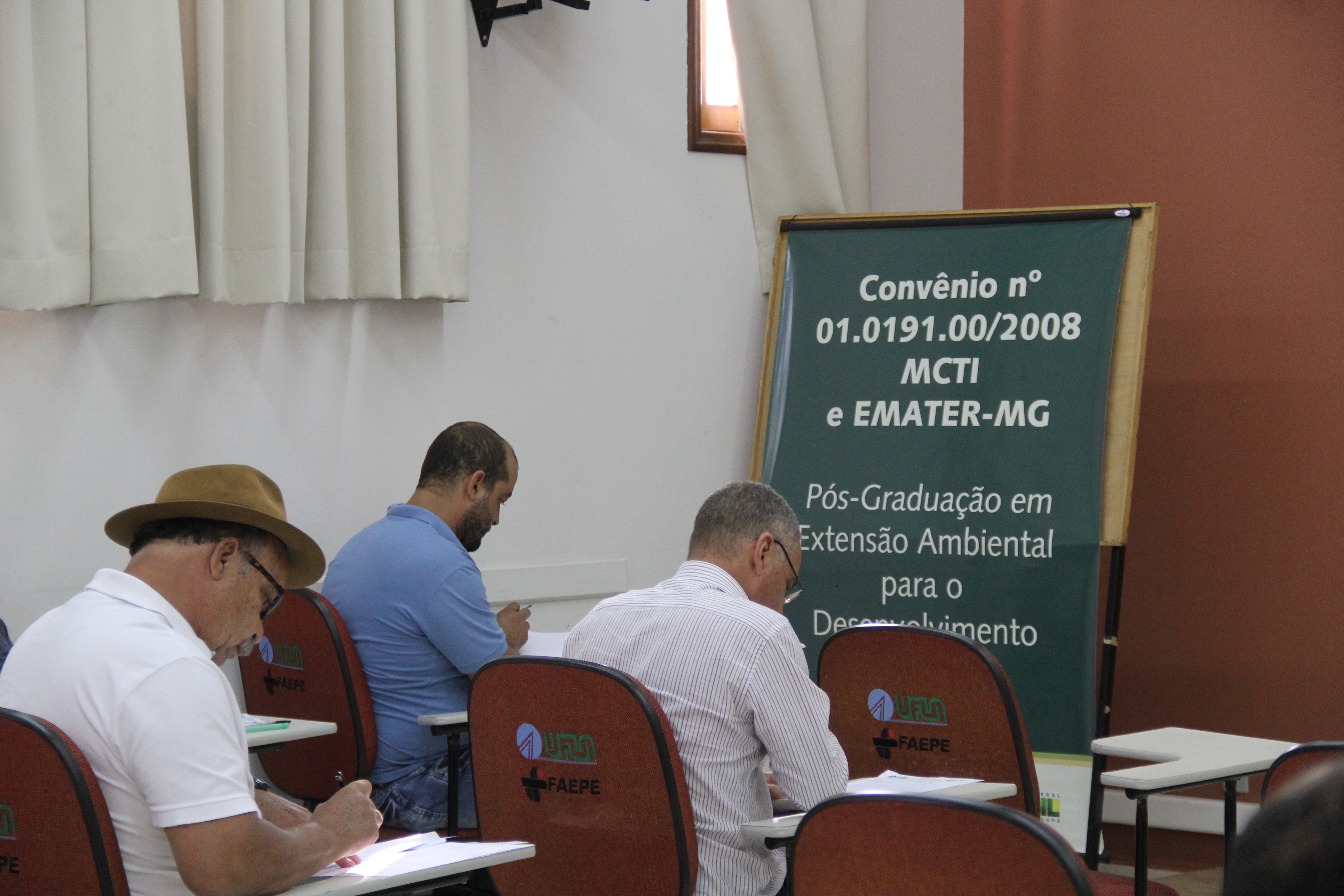 O encontro presencial final dos módulos optativos do curso de pós-graduação Lato Sensu “Extensão Ambiental para o Desenvolvimento Sustentável”, que capacitou 400 técnicos da Empresa de Assistência Técnica e Extensão Rural do Estado de Minas Gerais (Emater–MG), acontece em todo o mês de agosto na Universidade Federal de Lavras (UFLA), onde são realizadas as provas finais e as defesas de Trabalho de Conclusão de Curso (TCC´s).