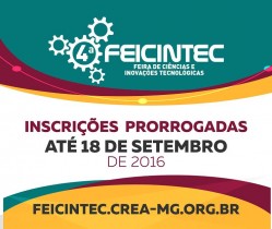A quarta edição da Feira de Ciências e Inovações Tecnológicas (Feicintec) do Conselho Regional de Engenharia e Agronomia de Minas Gerais (Crea-Minas) está com as inscrições abertas até o dia 18 de setembro. Os interessados poderão se inscrever pelo site feicintec.crea-mg.org.br. Os trabalhos participantes devem ser produzidos por alunos regularmente matriculados em cursos técnicos, tecnólogos e de graduação cadastrados no Crea-Minas, que abranjam as áreas de engenharia, agronomia, geologia, geografia e meteorologia.