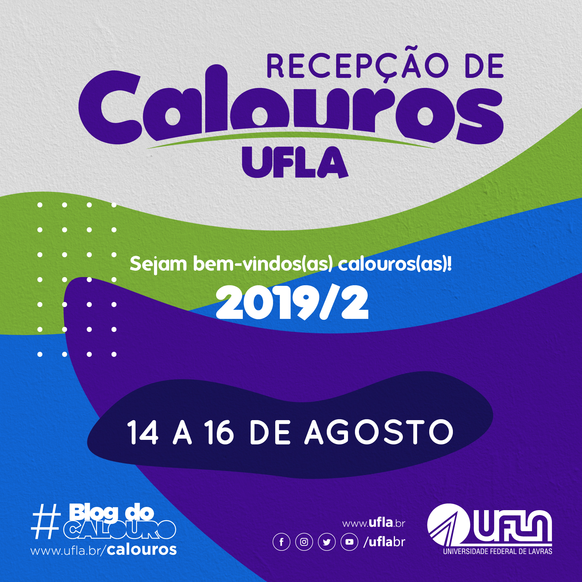 A Universidade Federal de Lavras (UFLA) realiza entre os dias 14 e 16/8 a recepção dos calouros 2019/2. As atividades promovidas pela Pró-reitoria de Graduação (PRG) buscam integrar os novos estudantes e apresentar as estruturas dos cursos e da Universidade.