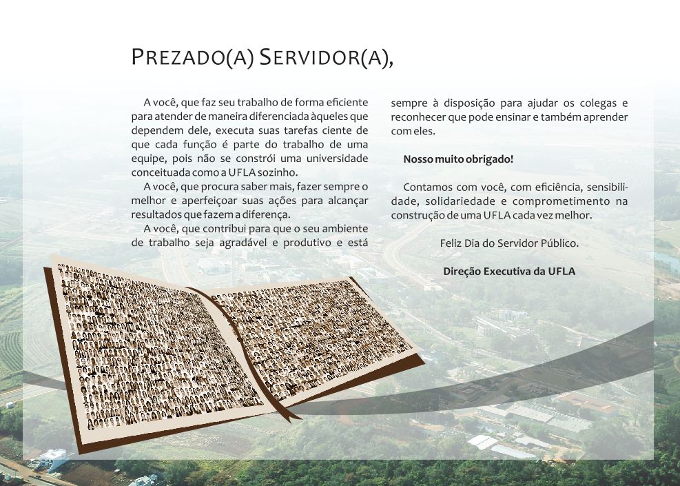 A você, que faz seu trabalho de forma eficiente para atender de maneira diferenciada àqueles que dependem dele, executa suas tarefas ciente de que cada função é parte do trabalho de uma equipe, pois não se constrói uma universidade conceituada como a UFLA sozinho.