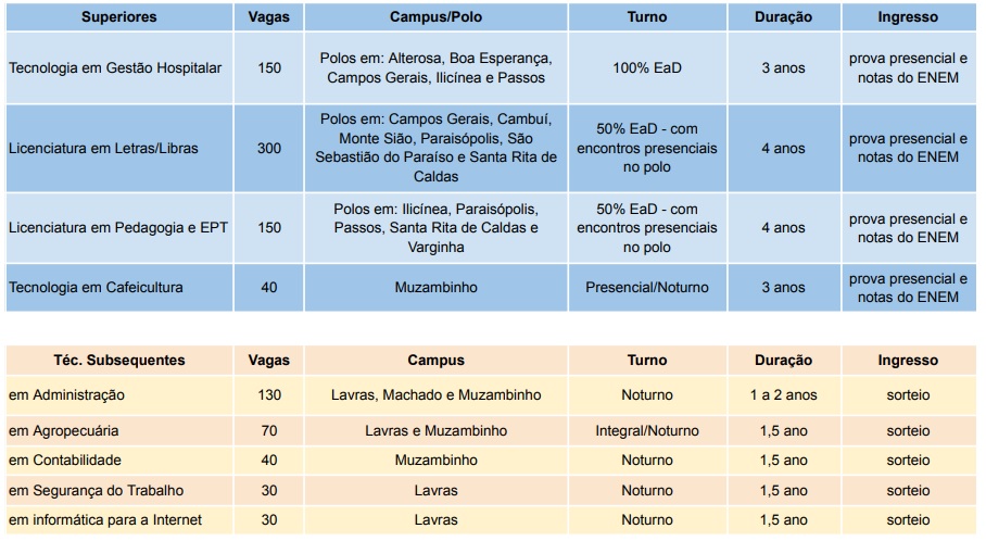 A seleção é para estudar presencialmente nos Campi Machado e Muzambinho e no Centro de Referência do Instituto na Universidade Federal de Lavras (UFLA), ou a distância (EaD) em um dos 12 de polos de apoio localizados em cidades da região. As aulas têm previsão de iniciar no segundo semestre de 2025.