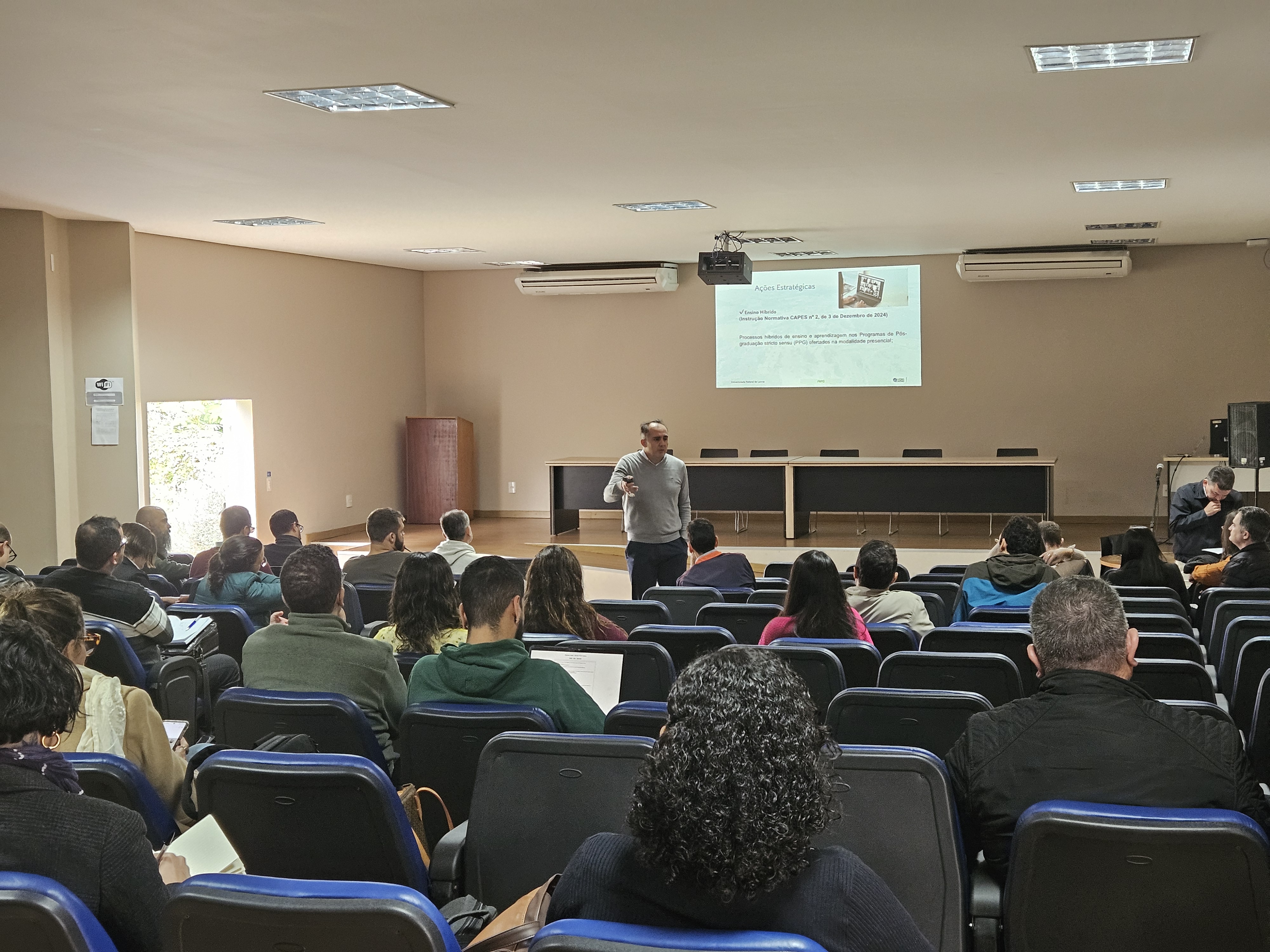 A programação incluiu uma palestra ministrada pelo pró-reitor e pelo seu adjunto, professor José Airton Rodrigues Nunes. Durante a apresentação, foram abordados temas cruciais para a condução dos programas de pós-graduação na UFLA. Entre os tópicos discutidos estavam a situação dos discentes da pós-graduação, a expansão dos programas, a avaliação da Capes/Sucupira, os pontos importantes de aprimoramento, a internacionalização e as ações estratégicas a serem implementadas.