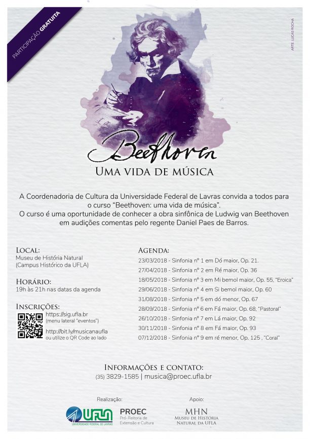 A Coordenadoria de Cultura da Pró-reitoria de Extensão e Cultura da UFLA (Proec) convida a todos para mais um encontro do curso "Beethoven: uma vida de música". O evento ocorrerá dia 29/6 no Museu de História Natural (Campus histórico da UFLA) das 19h às 21h.