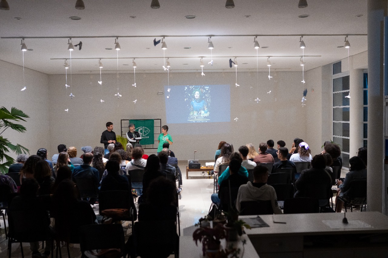 Na última sexta-feira, 16 de maio, o Centro de Cultura da Universidade Federal de Lavras (UFLA) recebeu a exibição do filme Lispectorante como atividade de pré-abertura do VERdeCINE – Festival Socioambiental de Filmes. O evento, que começou às 18h30 com entrada franca, reuniu aproximadamente 80 pessoas e contou com uma roda de conversa após a sessão. A noite foi marcada por trocas intensas entre público e realizadores, em especial com forte participação de estudantes do curso de Letras da UFLA.