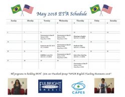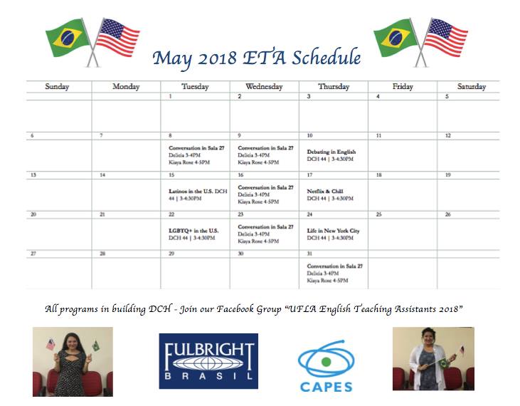 Com a meta de desenvolver atividades que proporcionem intercâmbio cultural e artístico entre Brasil e Estados Unidos, as ETAs irão ministrar oficinas no mês de maio abertas a toda a comunidade acadêmica. As atividades ocorrerão na sala 44, das 15h às 16h30, no Departamento de Estudos da Linguagem (DEL/UFLA). Os interessados em participar podem efetuar a inscrição no Sistema Único de Gestão da UFLA.
