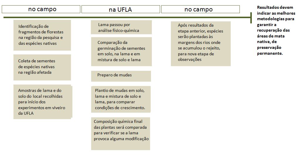 O estudo, dentro da UFLA, passa ainda por várias outras etapas: foi necessário confirmar a qualidade das sementes por meio de testes de germinação; a lama recolhida na região de Bento Rodrigues foi analisada para se identificar sua composição; mensalmente uma pequena amostra das mudas em análise precisa ser desmanchada para medição, pesagem e verificação do sistema radicular para acompanhamento das condições de crescimento; e em uma etapa posterior será necessário analisar a composição das plantas para verificar que se há alterações químicas em decorrência do tipo de material que lhes servem como substrato.