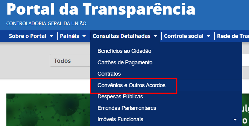 2. No menu superior, localizar “Consultas Detalhadas” -> “Convênios e Outros Acordos”: