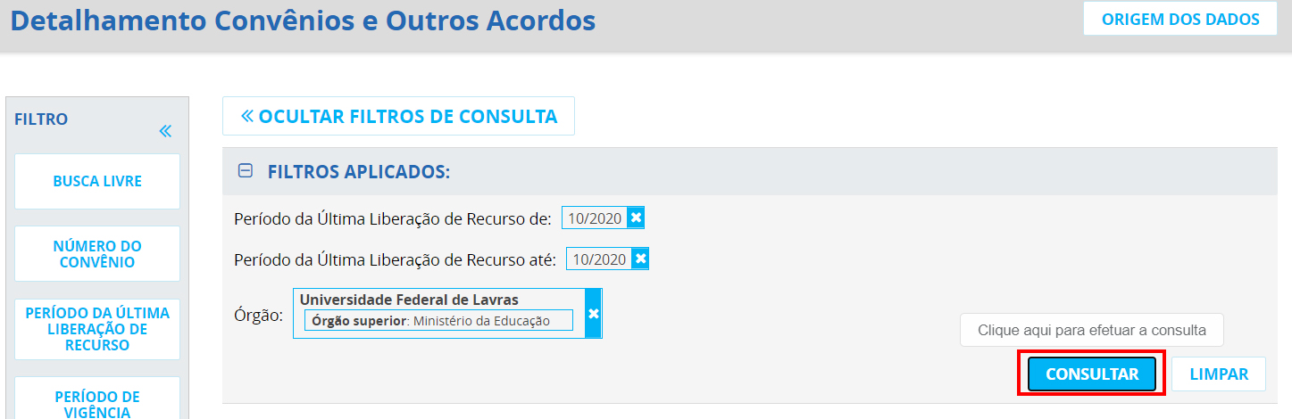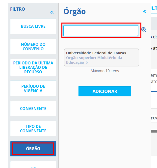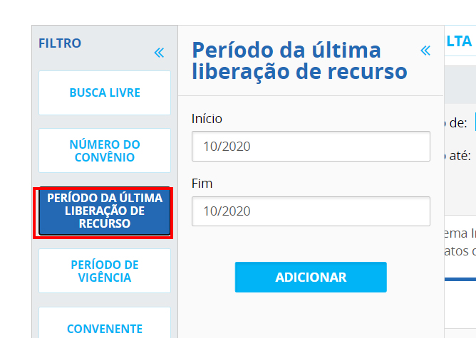 3. Utilizar a barra lateral esquerda de filtros para adicionar um filtro de Período e Órgão, como nos exemplos: