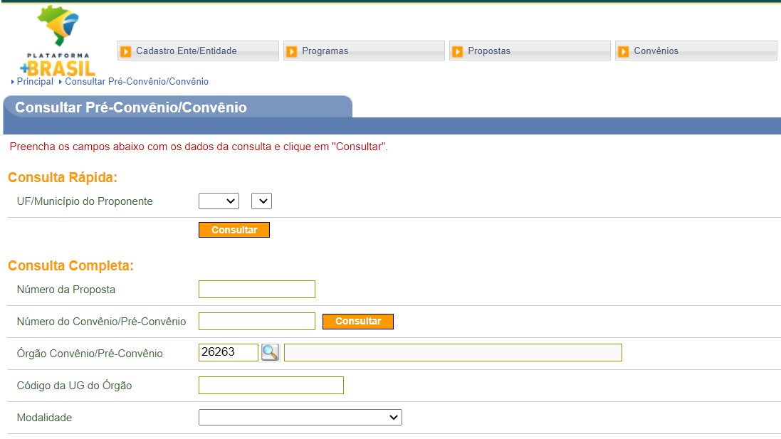 3. No campo "Órgão Convênio/Pré-Convênio" colocque o código 26263, que é o da UFLA.