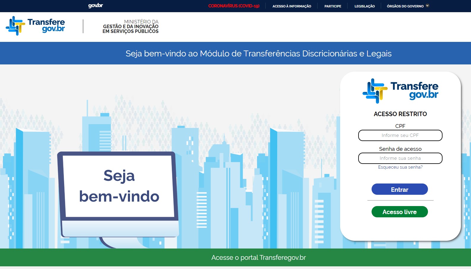 2. Na tela inicial, clique na opção "Acesso Livre" logo abaixo da tela de login.