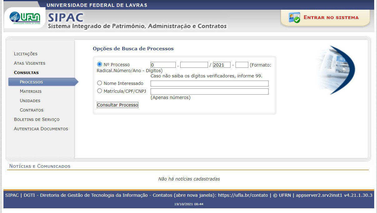 O Sipac, antigo sistema utilizado para a tramitação de processos da UFLA, continua funcionando apenas para consulta dos processos já tramitados na Instituição. Nele é possível realizar uma pesquisa dos processos públicos da UFLA anteriores ao ano 2023. A consulta pode ser realizada por qualquer pessoa, sem a necessidade de cadastro ou autenticação.