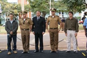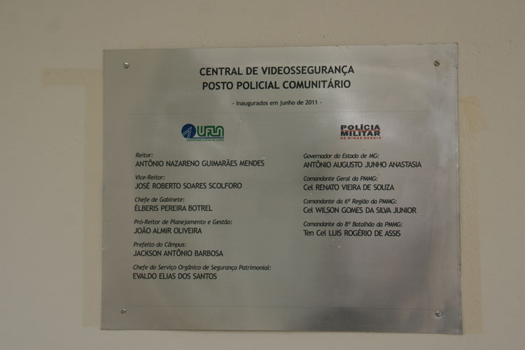 Foi inaugurado nesta quarta-feira (29), às 11h, o Posto Policial Comunitário fixo da Universidade Federal de Lavras (UFLA), em parceria com a Polícia Militar de Minas Gerais, que também abrigará a Central de Videossegurança da Universidade. O reitor da UFLA, prof. Antônio Nazareno Guimarães Mendes; o comandante da 6ª Região da Polícia Militar de Minas Gerais (PMMG), coronel Wilson Gomes da Silva Junior e o comandante do 8º Batalhão da PMMG, tenente coronel Luis Rogerio de Assis, foram os responsáveis pelo desenlace da fita inaugural do Posto.