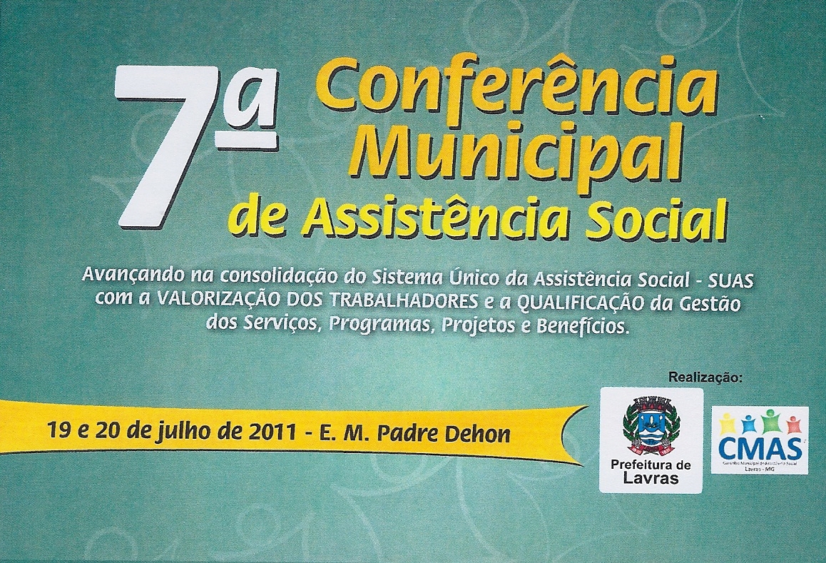 Nos dias 19 e 20 de julho, a Prefeitura Municipal de Lavras, por meio da Secretaria Municipal de Promoção da Cidadania, realiza a 7ª Conferência Municipal de Assistência Social. A Conferência, aberta à comunidade, será realizada no auditório da Escola Municipal Padre Dehon com o tema “Avançando na Consolidação do Sistema Único da Assistência Social (SUAS) – com a Valorização dos Trabalhadores e a Qualificação da Gestão, dos Serviços, Programas e Projetos Socioassistenciais”.