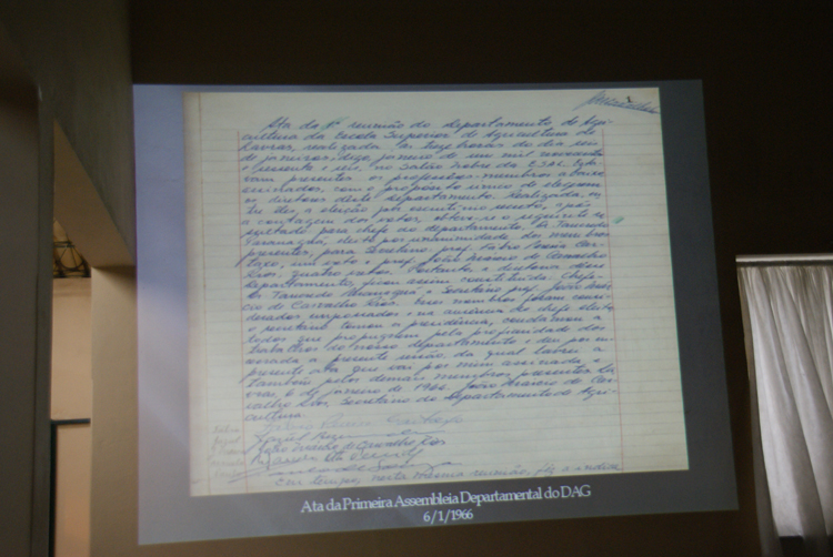 O professor Gabriel Carvalho conduziu os convidados a um resgate histórico do Departamento, instalado inicialmente no salão nobre da Escola Superior de Agricultura de Lavras – ESAL, tendo como primeiro chefe o professor Tancredo Paranaguá; subchefe o professor Marcelo Oto Penido; e como secretário o professor João Márcio Rios. Em 1970, a sede do DAG foi transferida para o câmpus novo.