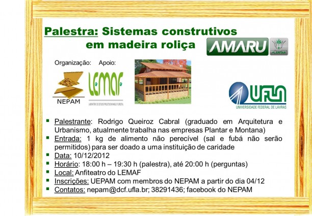 Na segunda-feira (10), das 18 às 20 horas, o Núcleo de Estudo em Painéis de Madeira (Nepam) promove a palestra “Sistemas construtivos em madeira roliça”, com a apresentação do arquiteto Rodrigo Queiroz Cabral. A inscrição pode ser realizada na Unidade Experimental em Painéis de Madeira (Uepam) ou no local do evento, mediante a entrega de um quilo de alimento não perecível (exceto sal e fubá). Os alimentos serão doados a uma instituição filantrópica de Lavras.
