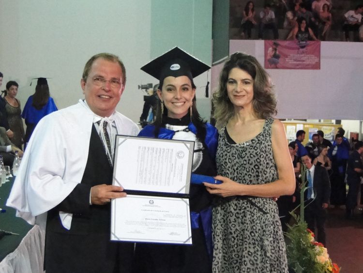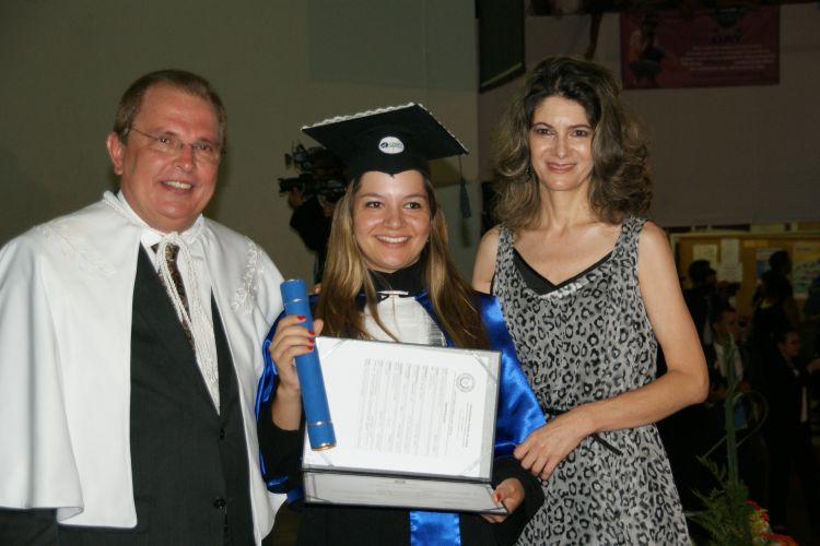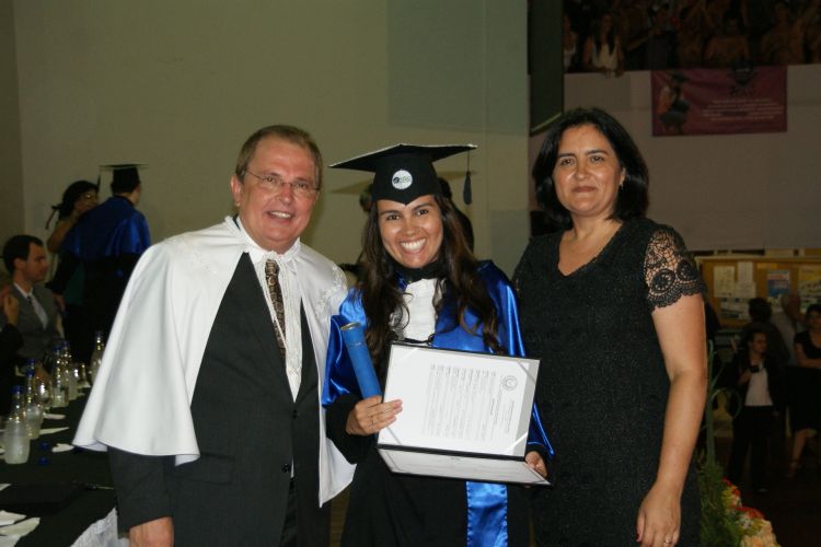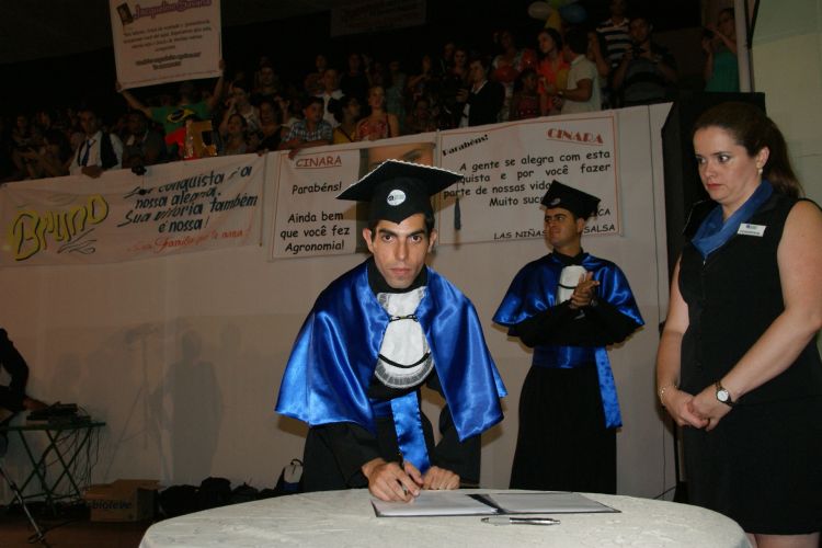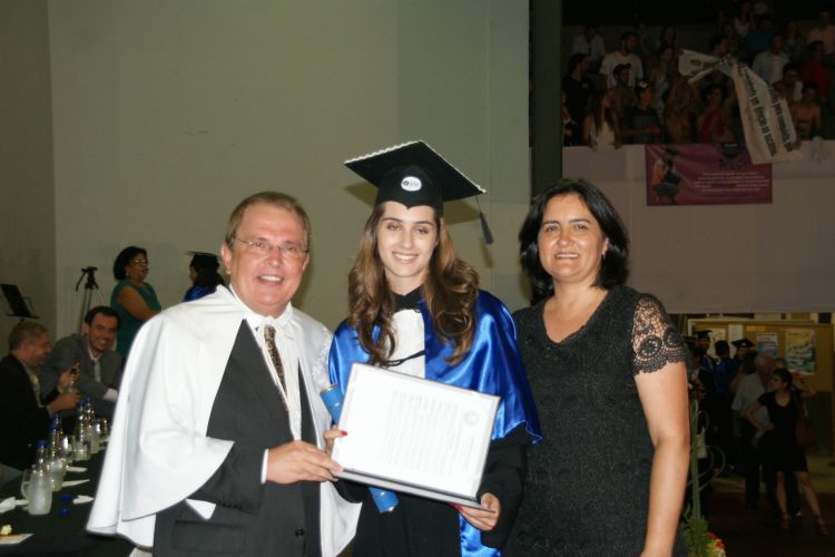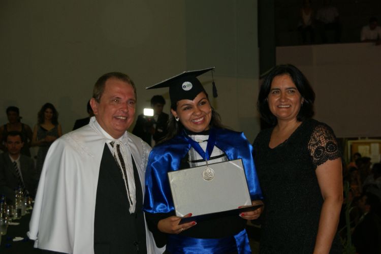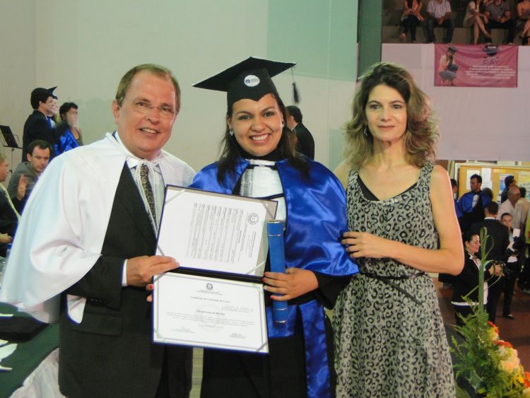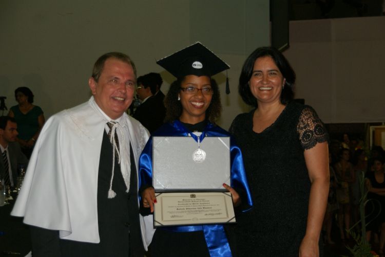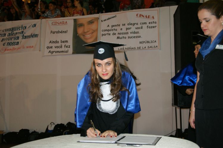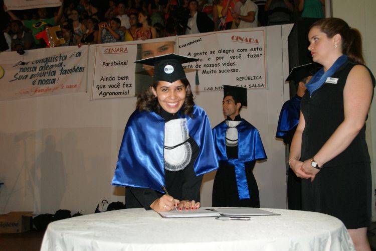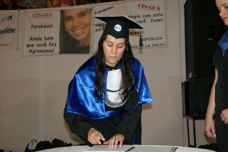 Entre os formandos da turma de Administração, Suluza Horário Absul Gafar, de Moçambique, finalizou a importante etapa de sua vida ao lado de amigos e familiares. Na cerimônia estavam presentes os símbolos de sua Pátria, a bandeira e o Hino de Moçambique.