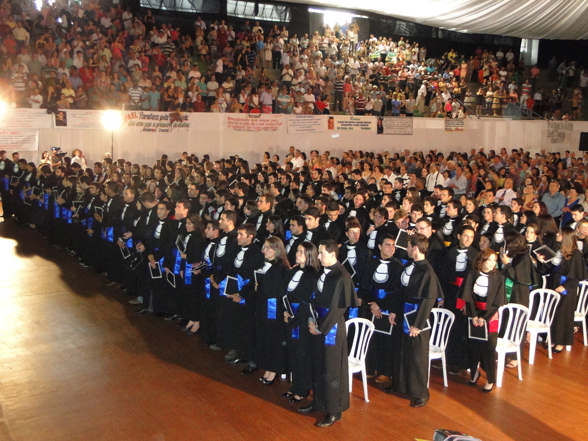 No dia da colação de grau, os formandos devem estar no Ginásio uma hora antes da colação, impreterivelmente, já vestidos com a beca.