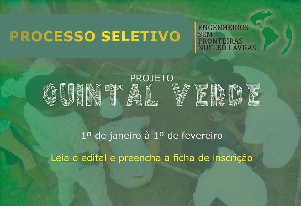 A organização não governamental (ONG) Engenheiros Sem Fronteiras – Núcleo Lavras abriu processo seletivo para seu novo projeto, chamado Quintal Verde. Trata-se de um plano para realizar a construção de uma horta comunitária com a participação de crianças.